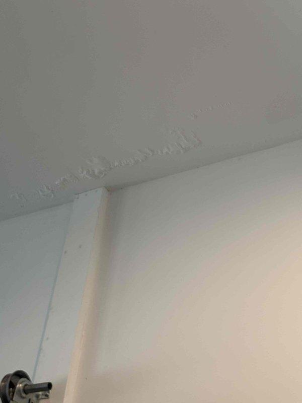 Responded to report of water intrusion in wall assembly. Upon inspection, identified significant separation at wall-to-ceiling joint with evidence of moisture penetration and debris accumulation in gap. Documented existing conditions with photographic evidence showing compromised joint integrity and surface markings requiring further assessment for proper remediation and sealing.