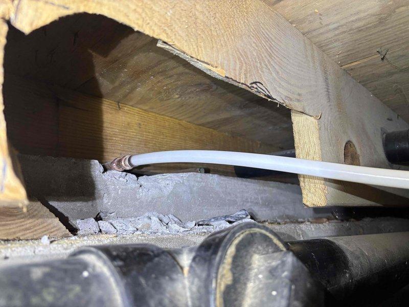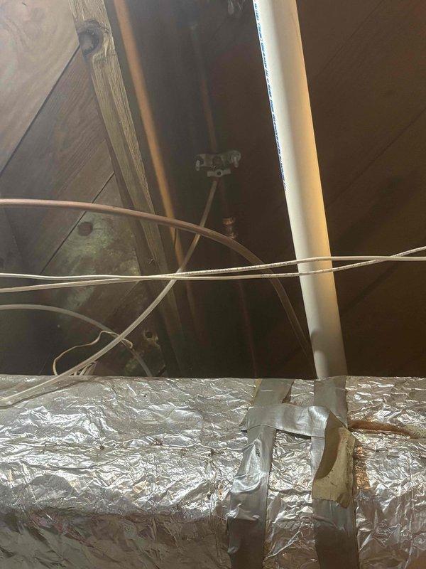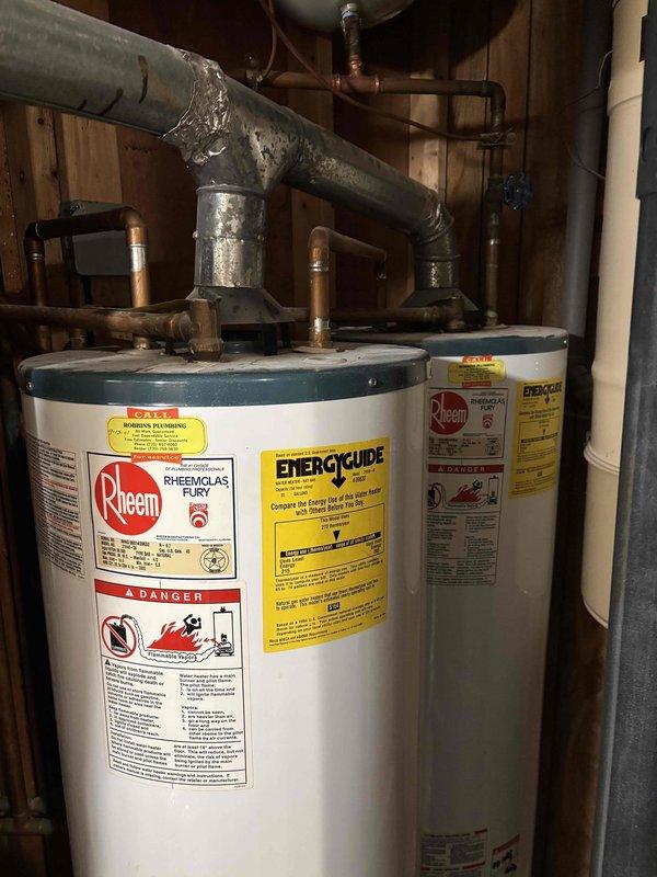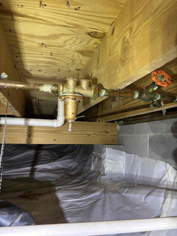 Located and repaired a previously capped pipe in a crawlspace area, which required accessing the structural section where utilities pass through wooden joists. Inspected the surrounding dual Rheem water heater installation to ensure proper connections and verify no additional leakage issues in the plumbing system.