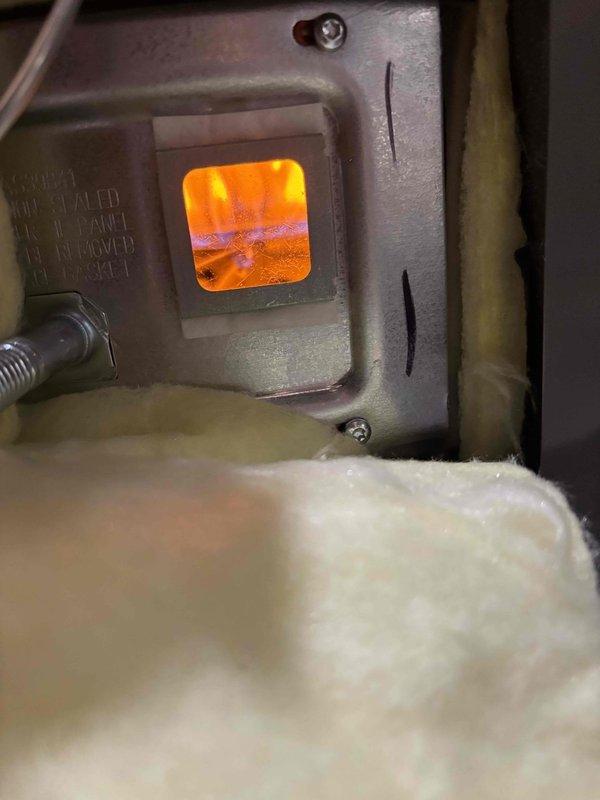 Installed water heater with drain pan per service request. Inspected pressure gauge showing approximately 20-30 PSI, confirmed proper operation with flame visible through sight glass. Repaired leaking toilet in first bedroom by replacing broken flange.
