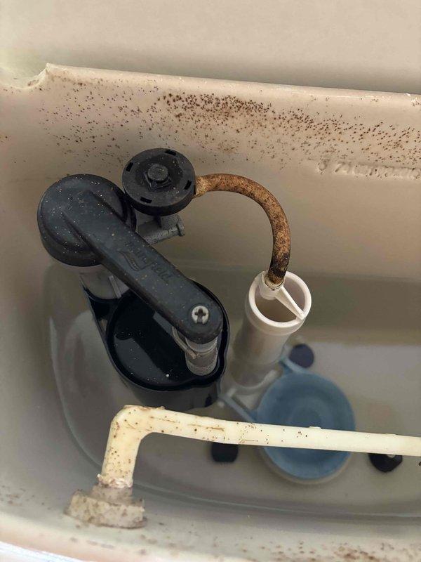 # Leaky Toilet Repair Responded to service call for toilet supply leak originating from tank. Upon inspection, identified severely corroded metal fill valve supply tube and deteriorated tank components with extensive mineral buildup and rust throughout the system. Replaced corroded supply tube, installed new fill valve assembly, and tested system for proper operation and leak elimination.