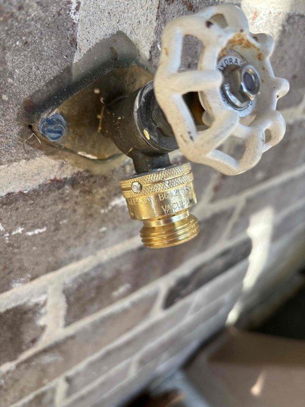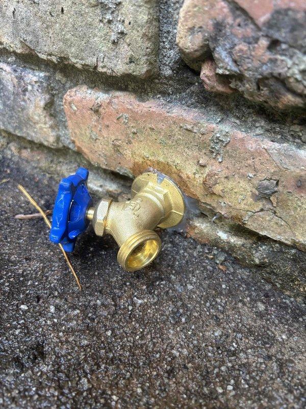# Job Completion Summary Relocated exterior hose spigot and water supply line as specified in approved quote. Addressed washing machine drainage issue where wastewater was backing up into laundry room sink following recent appliance installation. # Work Performed Successfully repositioned the outdoor hose bib and associated copper supply piping. The brass valve with blue handle wheel was remounted against the brick masonry exterior wall, ensuring proper clearance and secure attachment. Supply line routing was modified to accommodate the new spigot location while maintaining code-compliant installation standards. Investigated and resolved the laundry drainage backup issue. Accessed plumbing infrastructure through crawl space to inspect drain lines, venting, and connection points. The backup condition was traced to inadequate drainage capacity or improper venting following the new washing machine installation. Cleared obstruction and verified proper water flow from washing machine di
