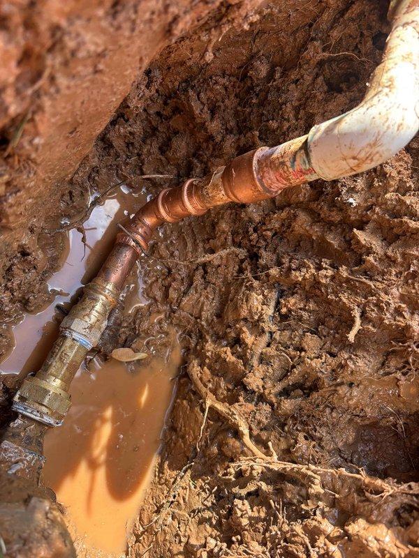 Responded to high water bill complaint and performed diagnostic investigation. Excavated water service line and discovered corroded copper piping with brass fittings showing significant deterioration and patina buildup. Located active leak in underground plumbing assembly where copper pipe connects to PVC supply line through brass valve connections. Standing water and saturated soil conditions in trench confirmed continuous water loss from compromised fitting. Verified system pressure at 80-90 PSI using calibrated pressure gauge, which exceeded normal operating parameters and likely contributed to joint failure at weakened connection points. Exposed and assessed full plumbing assembly including shutoff valve and transition fittings between copper and PVC sections. Documented conditions with photographs showing extent of corrosion, water accumulation, and component degradation requiring replacement to resolve excessive water consumption issue.