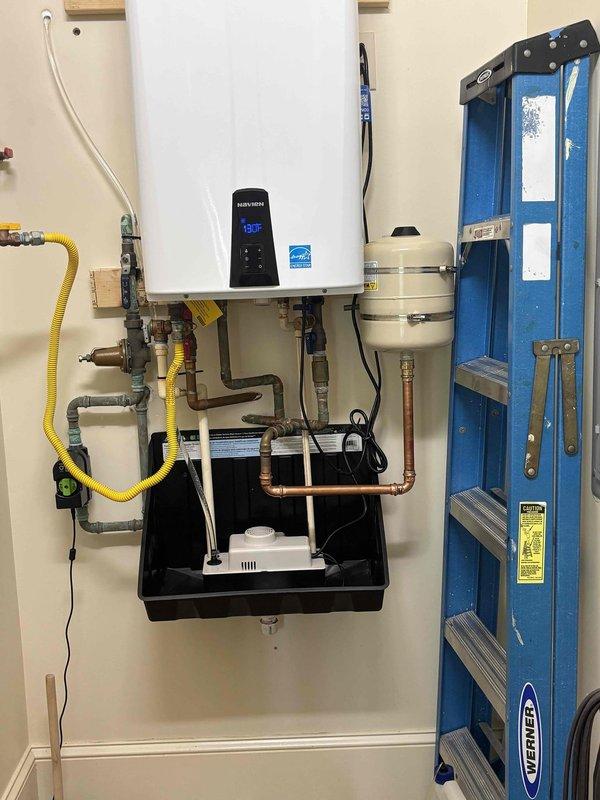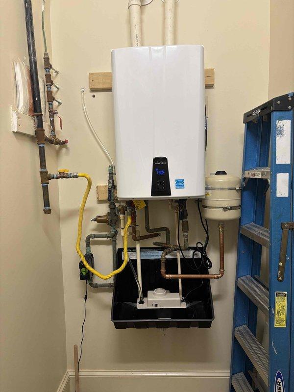 Completed installation of an Energy Star certified tankless water heater mounted on wall with appropriate backing. System includes copper and PVC piping connections, flexible gas line, shut-off valves, condensate collection pan with pump, and expansion tank. Unit was successfully tested with operational temperature reading of 139°F.