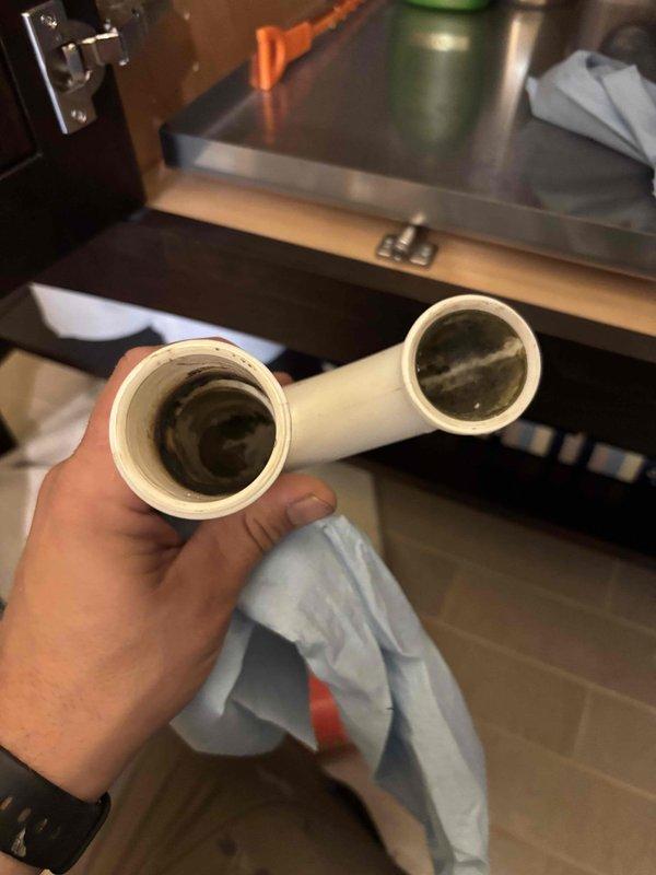 Diagnosed low hot water pressure issue and found significant buildup in the plumbing system, particularly in the PVC pipes. Removed and cleaned affected pipe sections, replaced clogged P-traps that were restricting water flow, and upgraded one sink from pull-up drain to pop-up assembly for improved functionality.