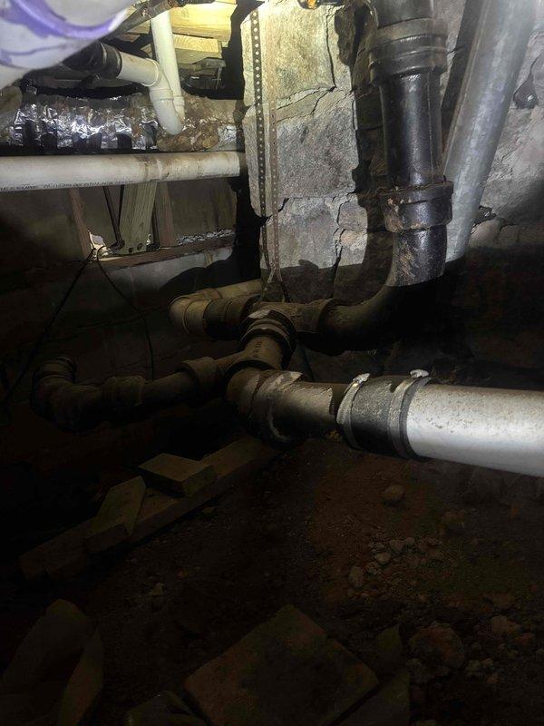 Performed sewer scope inspection at property lacking cleanout access. Documented existing plumbing system including junction points between PVC and metal pipes showing signs of wear in basement/crawl space. Observed expansion tank mounted on concrete wall connected to galvanized ductwork and copper piping with brass fittings, with all components appearing to be functional parts of the building's utility infrastructure.
