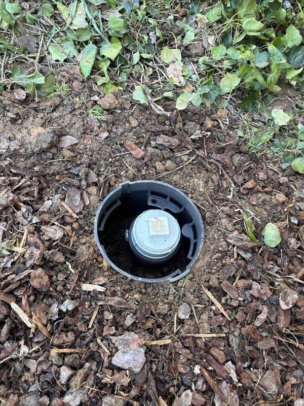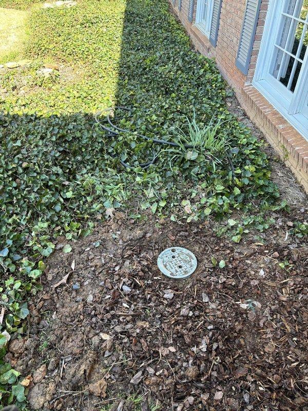 Inspected and documented irrigation/utility access point in landscaped area alongside brick residence. Access point features a circular housing with blue/gray cap embedded in mulched soil area surrounded by ground cover vegetation. Photographic documentation completed for service records.