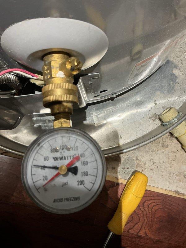 Diagnosed water heater temperature issue by testing pressure valve, which showed normal readings at approximately 40-50 PSI. Adjusted temperature control dial and verified proper operation, resolving the excessive hot water temperature problem.