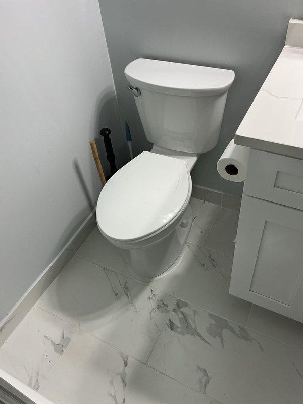 Successfully cleared two clogged toilets in a recently renovated bathroom with white marble-look tile flooring. Utilized professional plumbing equipment to restore proper drainage functionality, ensuring complete water flow and proper flushing operation in both fixtures.