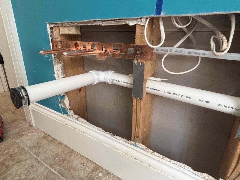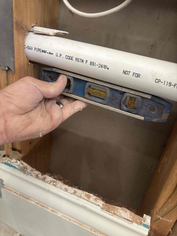 Performed inspection of exposed wall section with PVC and copper plumbing lines. Verified proper pipe installation and level alignment of PVC pipes using torpedo level. Documentation photos taken of the exposed framing and plumbing configuration for project documentation.