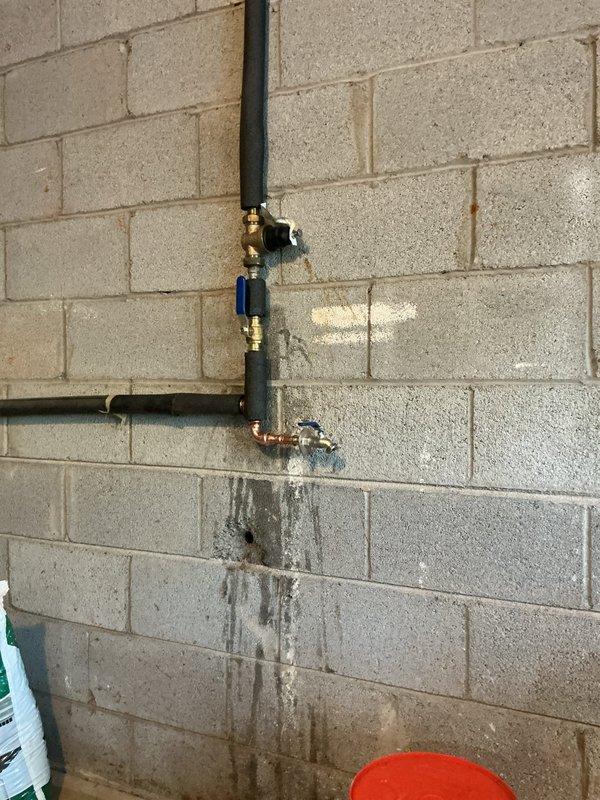 Reinspected water meter installation and identified active leak at pipe connection point, evidenced by water staining on concrete block wall beneath brass valve assembly. Documented condition with photographic evidence showing vertical insulated pipe with brass fittings and blue valve component where water is seeping from connection to copper piping section.