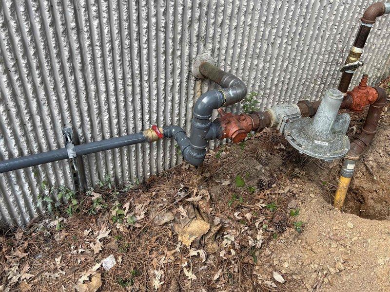 Completed gas line installation and plumbing infrastructure work at exterior location. Assessed existing weathered utility components including aged pressure regulator assembly and corroded identification plates, then installed new piping configuration with PVC elbows, backflow preventer, and proper wall mounting brackets along corrugated metal siding to meet code requirements.
