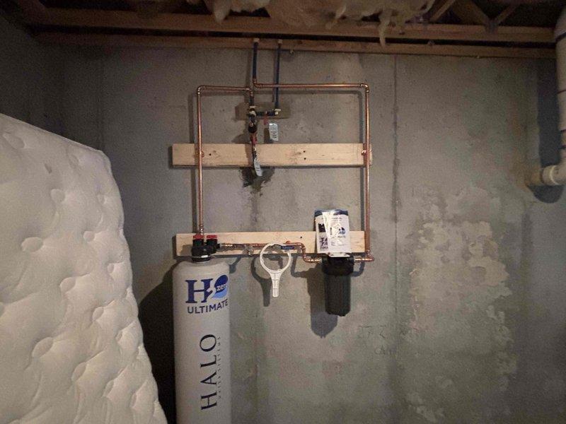Completed installation of two Rheem water heaters with full venting systems, including copper supply piping, brass shut-off valves, yellow flexible gas lines, and proper exhaust ductwork. Additionally installed a HALO H2O ULTIMATE whole-house water treatment system with copper manifold framework, mounting boards, black filter cartridge, pressure gauges, and integrated plumbing connections to ensure comprehensive water filtration throughout the property.