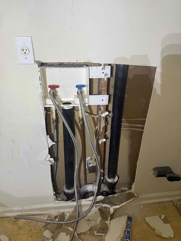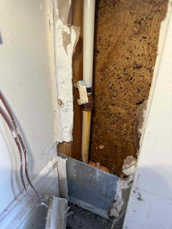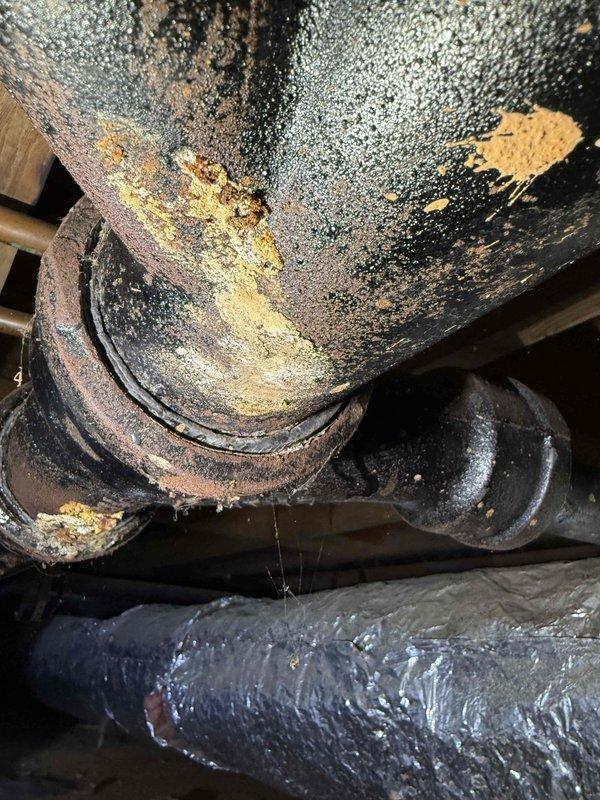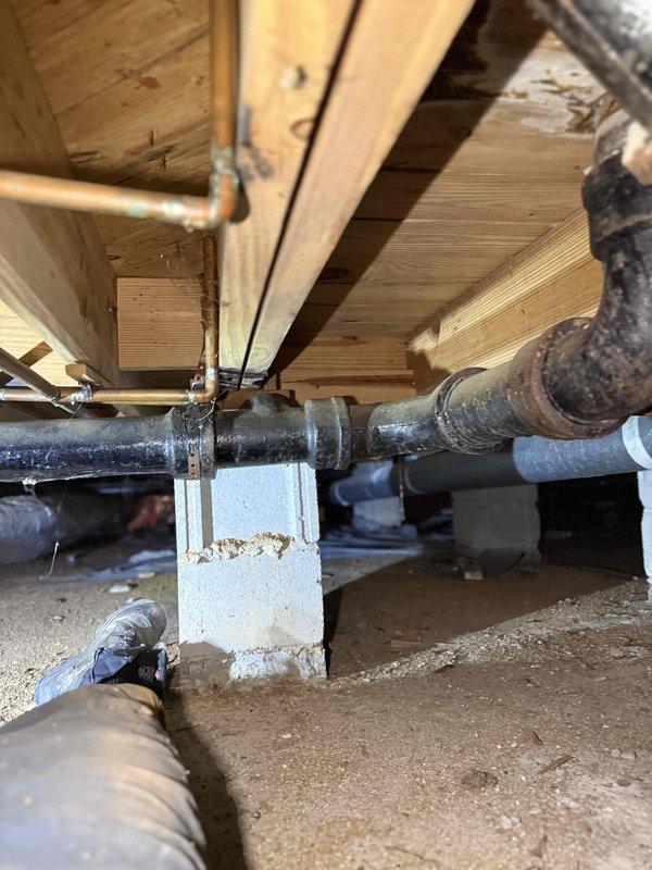 Inspected and diagnosed cast iron drain pipe that required replacement. Accessed plumbing through wall cutout, revealing water damage to subflooring. Replacement job will require assistant due to complexity of accessing crawlspace area and managing the deteriorated cast iron pipe system.