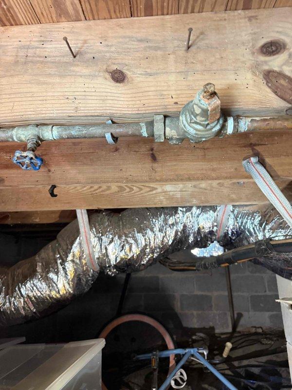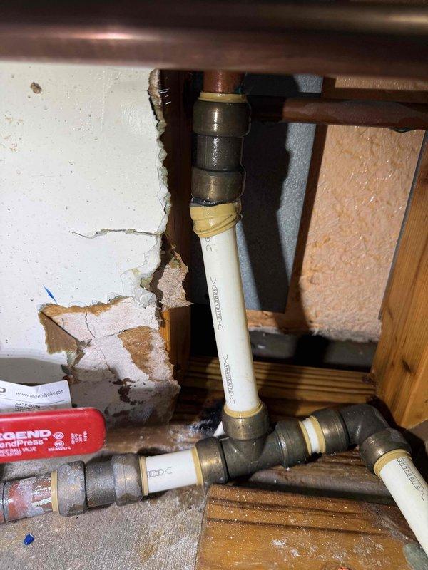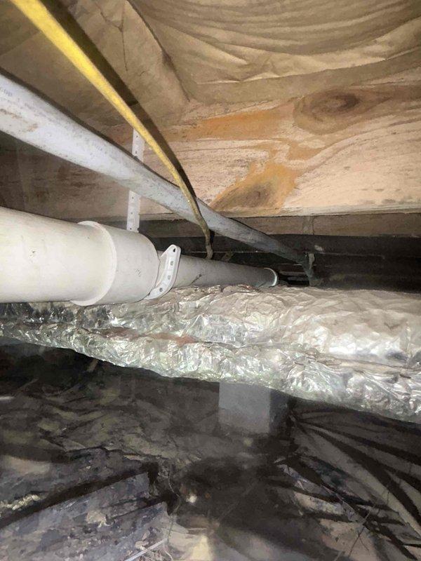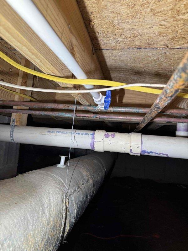 Inspected reported leak in back yard. Upon examination, found no active leaks in the yard itself, but discovered evidence of previous water seepage in the crawlspace. Identified PVC pipe connection with purple primer/glue that appears to have been recently repaired. Verified all current connections are secure and properly sealed.