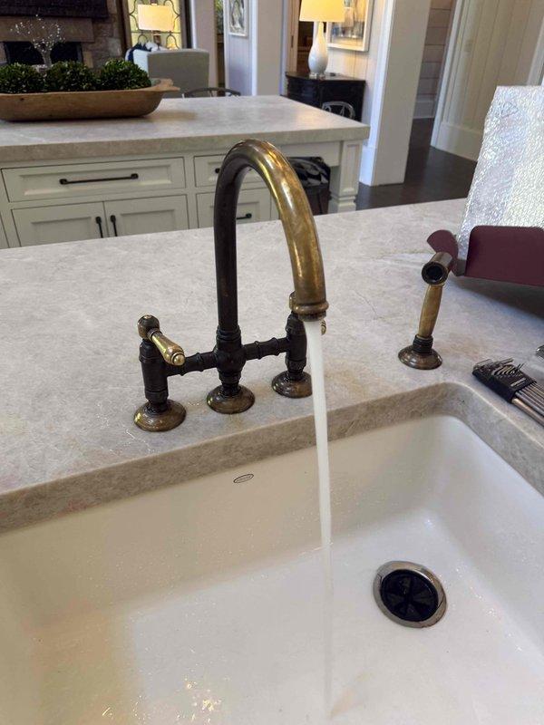 Successfully installed new kitchen faucet with bridge-style design and brass/bronze finish. Replaced existing valve components and verified proper water flow and function of both main spout and side sprayer attachment. Installation complete with no leaks observed during testing.
