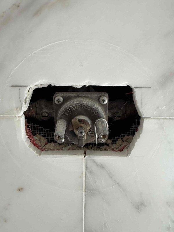 Diagnosed and inspected leaking toilet, finding deteriorated toilet flange with significant damage, cracking, and mold buildup requiring replacement. Created wall access point to examine plumbing connections and investigated hot water temperature fluctuation issues throughout property, particularly in master shower where controls were malfunctioning.