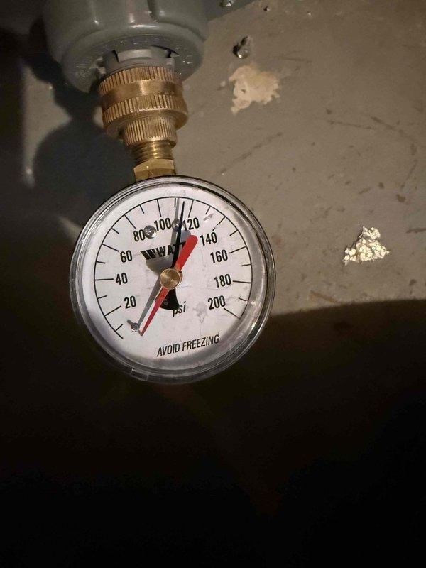 Completed pressure evaluation for basement sink restoration. Testing revealed water pressure at approximately 110-120 PSI, significantly exceeding recommended residential levels (typically 40-80 PSI). Recommended installation of pressure reducing valve (PRV) to prevent potential plumbing system damage before restoring water service to sink.