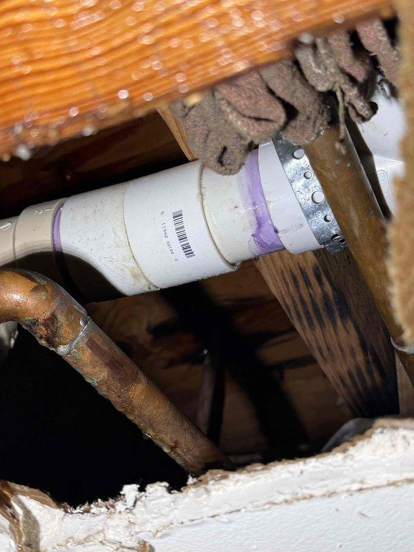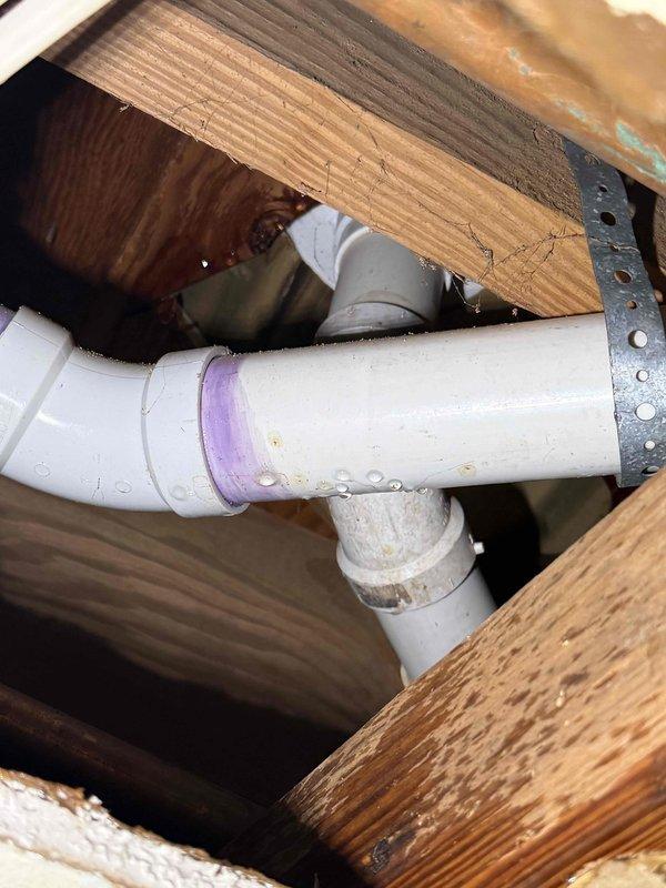 Investigated ceiling leak and identified moisture accumulation on wooden joists near PVC plumbing connections. Located issue at pipe joint with purple primer where condensation was evident. Applied proper sealing to affected joint and secured pipe with metal hanger to prevent future leakage.
