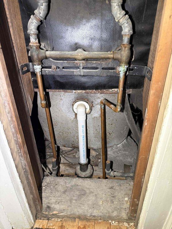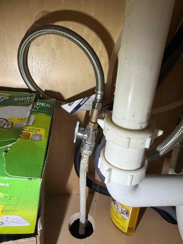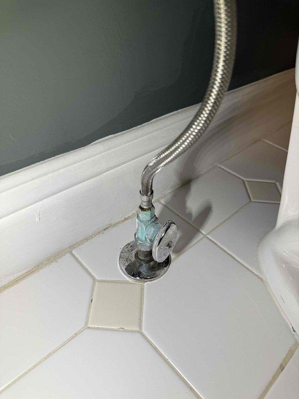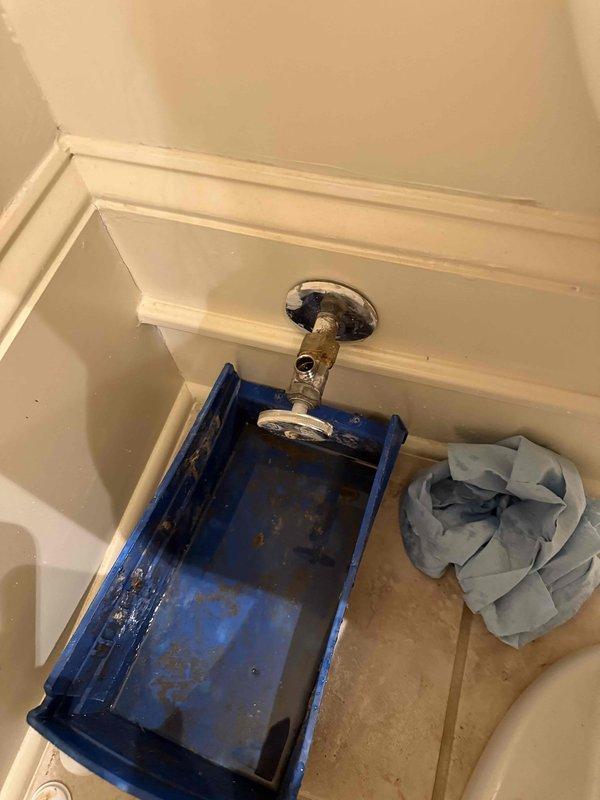 Responded to active water leak originating from third-floor bathroom and penetrating ceiling into second floor. Upon arrival, customer had already shut off main water supply, but leak continued dripping through ceiling. Investigated plumbing system above affected area, identifying compromised supply line connections and corroded valve assembly with visible mineral deposits at floor-level fixture. Inspected copper piping, brass fittings, and flexible braided supply lines in ceiling cavity, documenting condition of all components including red-handled shutoff valve and PVC connections near structural joists. Isolated leak source to deteriorated connection point at bathroom fixture where corrosion and mineral buildup indicated chronic moisture exposure, explaining continued dripping despite main water shutoff.