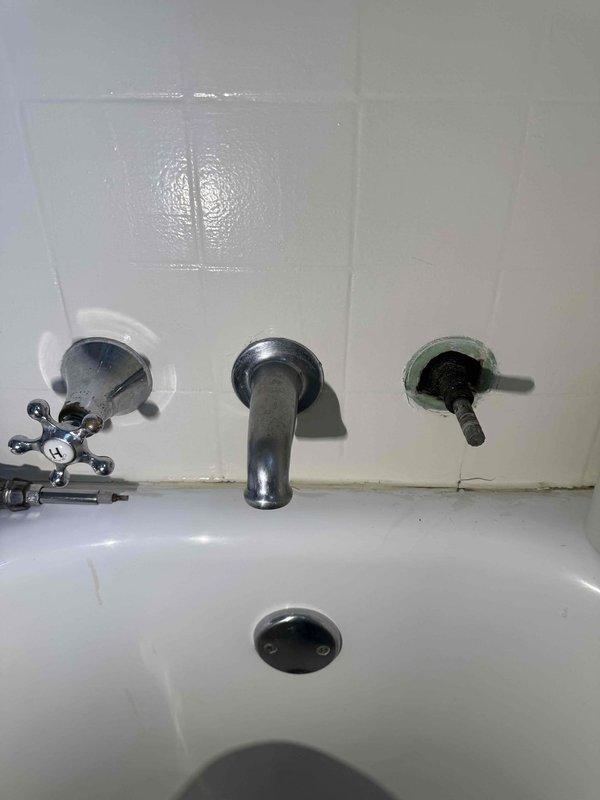 Diagnosed and repaired a leaking bathtub faucet that was dripping despite tightly closed valves. Replaced worn washers in both hot and cold water handles, with particular attention to the right valve which showed significant corrosion at the wall connection. Verified proper operation after repair with no leaks present.