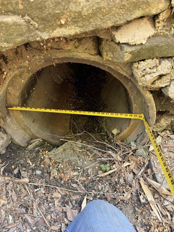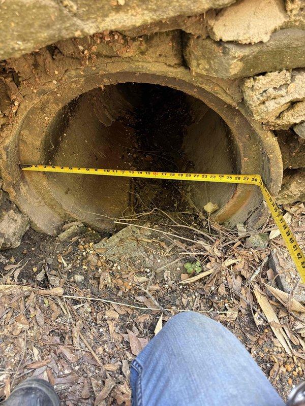 Conducted free estimate for collapsed yard drain. Inspection revealed a large circular drainage pipe (approximately 28 inches in diameter) embedded in stone/concrete structure with significant debris accumulation including twigs, leaves, and organic matter. Measurements were taken and photographic documentation completed to assess damage. Determined issue is separate from main sewer line.