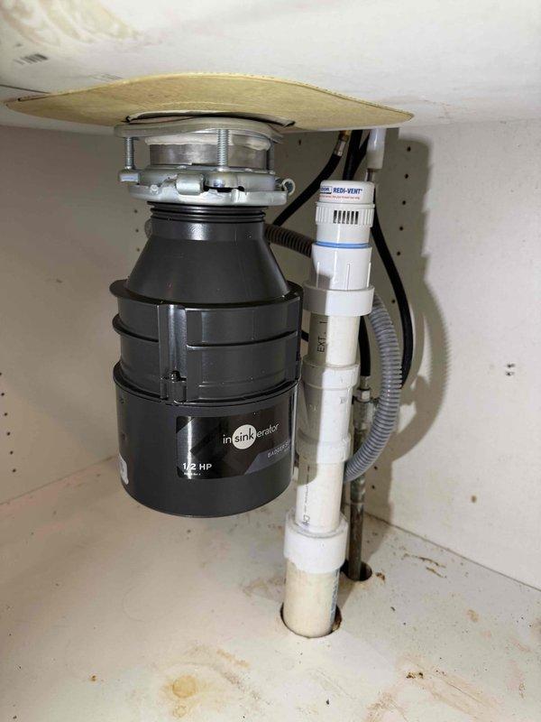 Responded to complaint of garbage disposal odor and bubbling in island sink. Upon inspection, identified improper drain venting causing air lock and sewage gas backup. Installed air admittance valve on disposal drain line to resolve negative pressure issues and eliminate odors. Tested system to confirm proper drainage and venting function.