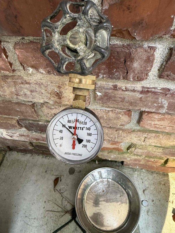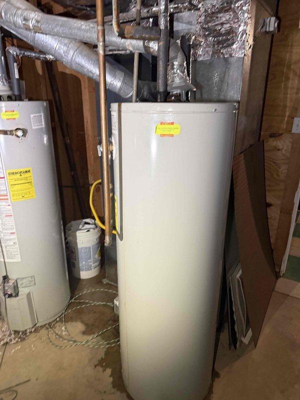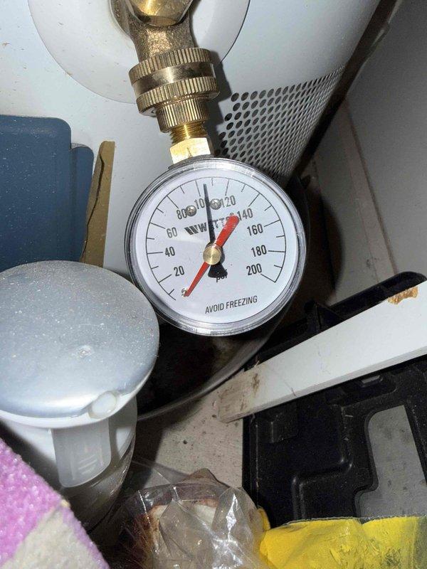 # Water Heater Service Report Responded to service call for leaking water heater with customer-isolated water supply via shutoff valve. Upon arrival, conducted thorough inspection of the water heating system and associated plumbing components. Documented existing equipment configuration including dual water heater setup with interconnected copper piping, gas supply lines, and pressure monitoring equipment. Inspected pressure gauge mounted on system showing WATTS brand equipment with 0-200 PSI range, connected to aged valve assembly exhibiting corrosion and patina buildup on brass fittings. Assessed condition of water heater units, noting manufacturer specification labels and current installation status. Evaluated flexible gas line connections, copper supply piping, expansion tank, and overhead ductwork for any related issues or safety concerns. Photographed equipment and leak source for documentation and estimate preparation. Provided customer with findings and reminded them that a