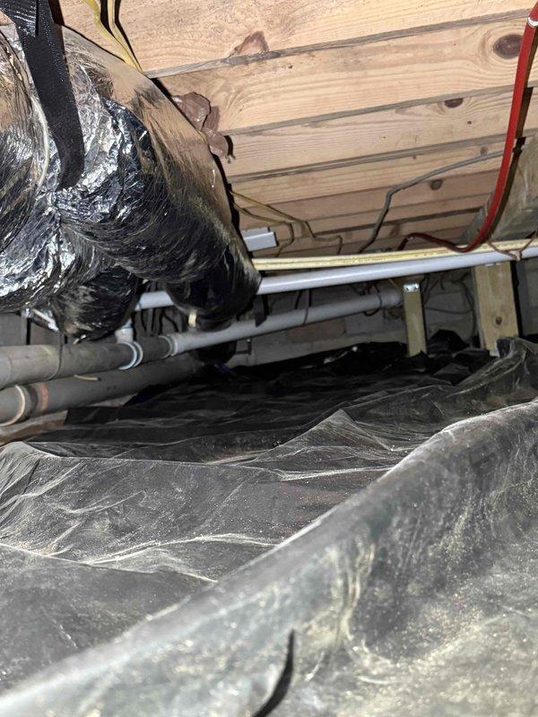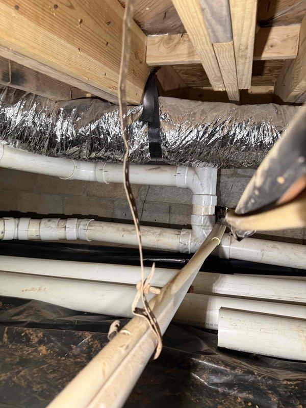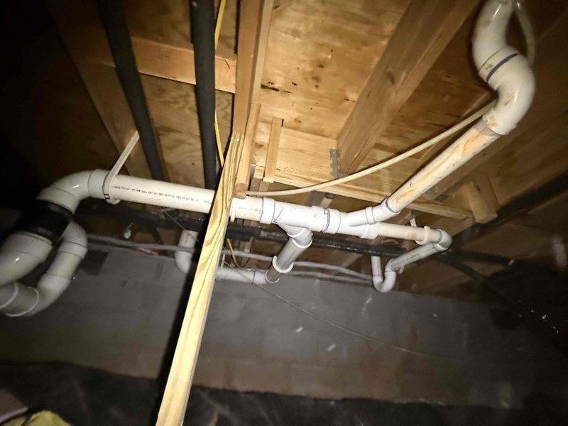 # Service Report: Main Line Stoppage Responded to a main line stoppage call and accessed the crawl space to diagnose and clear the obstruction. Upon inspection, located the affected drainage system consisting of multiple PVC drain lines and black ABS vent pipes running horizontally beneath the floor joists. Successfully cleared the main line stoppage using appropriate drain cleaning equipment, restoring proper flow and drainage throughout the system. Verified all fixtures were draining properly upon completion. Documented existing plumbing infrastructure conditions including pipe routing, support systems, and proximity to HVAC ductwork for service records.