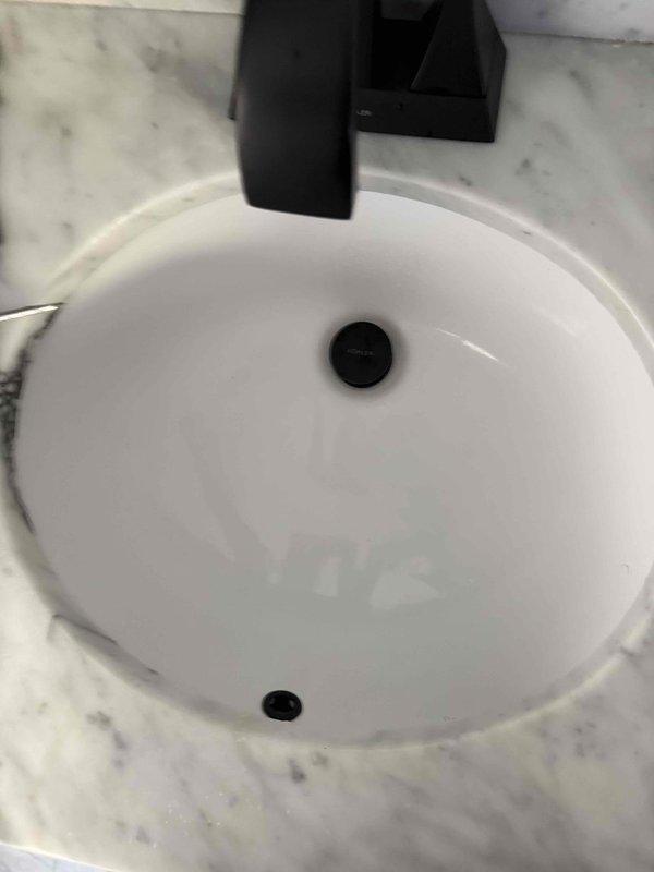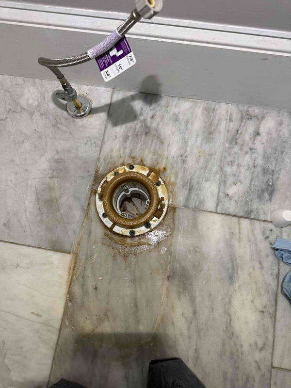 # Leak In Ceiling - Service Report Responded to report of water leak from third floor bathroom penetrating second floor dining room ceiling. Upon inspection, identified potential leak source at third floor bathtub area. Documented shower floor conditions revealing water staining and discoloration around brass drain assembly, with visible mineral deposits and brownish water marks on marble tile surfaces indicating chronic moisture issues. Photographed bathroom fixtures including sink installation and shower valve assembly with braided supply line for reference. Assessed additional plumbing concerns reported by customer. Inspected previously installed toilet exhibiting instability at floor mounting, requiring stabilization to prevent wax ring failure and potential water damage. Evaluated bathroom sink producing intermittent sewer odor upon initial water flow and occasional brown slime discharge, indicating possible P-trap or vent system deficiency requiring further investigation. Exami