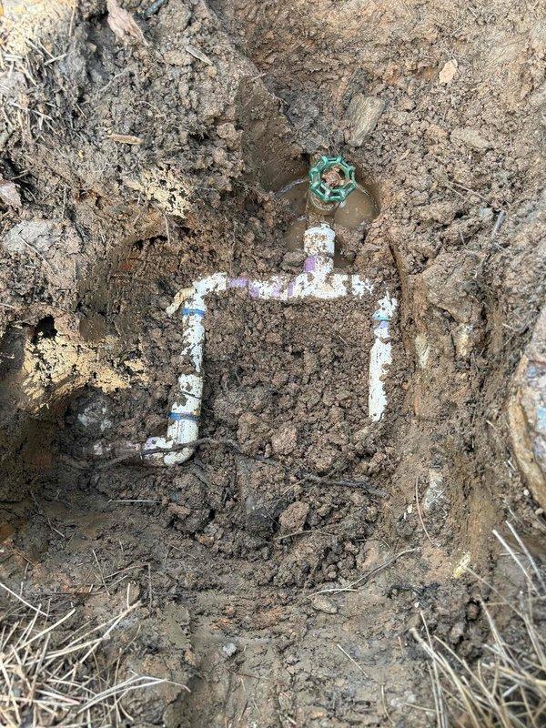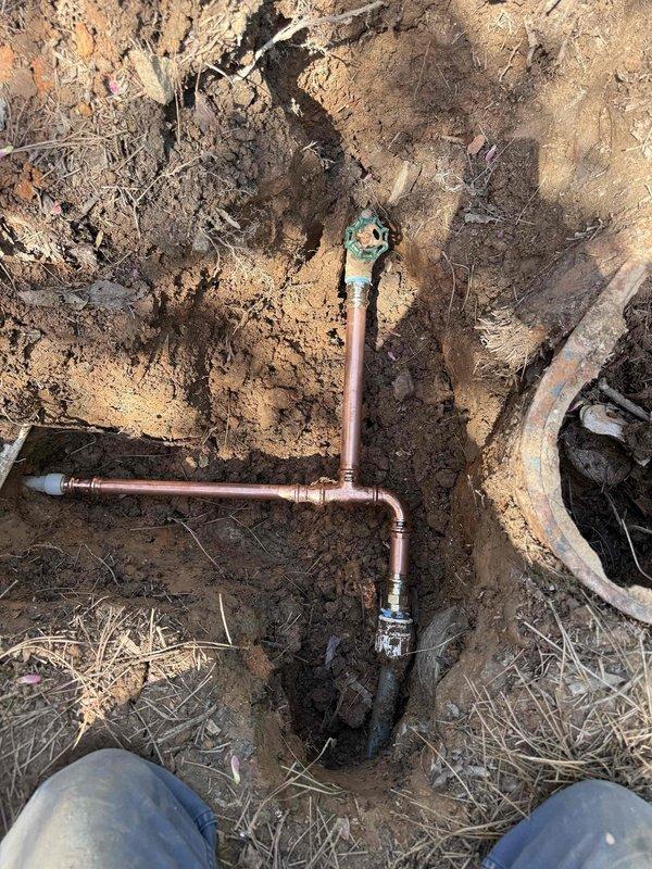 Responded to follow-up call regarding reported leak at meter box. Upon arrival, excavated and exposed the copper water line and meter connections to investigate the source of the leak. Inspected all pipe joints, fittings, and the meter valve assembly for signs of active leaking or moisture. Photographed the exposed piping system showing the T-junction configuration with brass fittings and the turquoise shutoff valve. All connections appeared secure with no visible leaks detected at time of inspection.