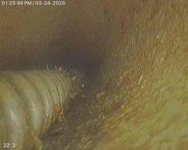 Responded to main line stoppage that was successfully cleared. Video inspection revealed root intrusion in the sewer line at approximately 22 to 30 feet, along with significant sediment and mineral buildup throughout the pipe interior. Provided estimate for permanent repair options to address root infiltration and prevent future blockages.