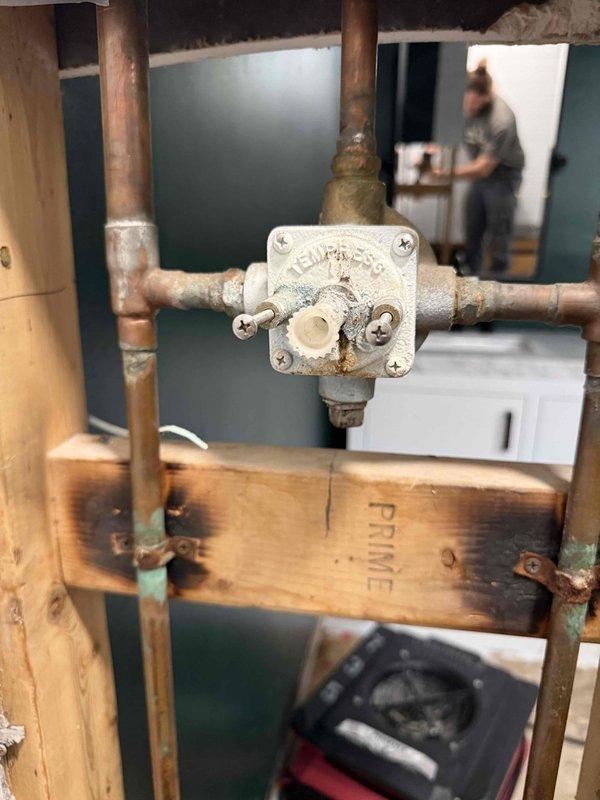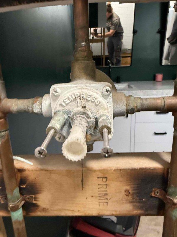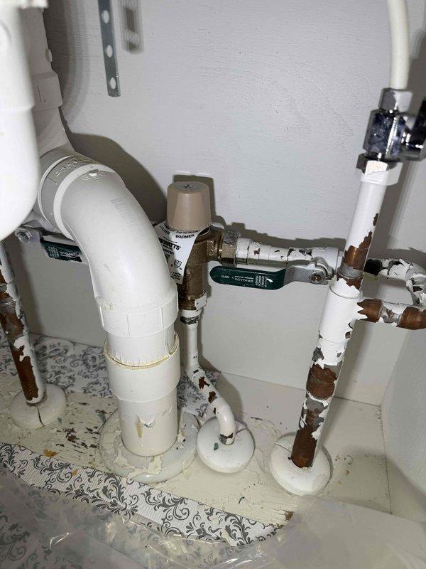 Installed new mixing valve assembly beneath bathroom sink to regulate water temperature and prevent scalding. Work included integrating valve with existing copper supply lines, ensuring proper connections with shut-off valves, and verifying system functionality with no leaks detected upon completion.