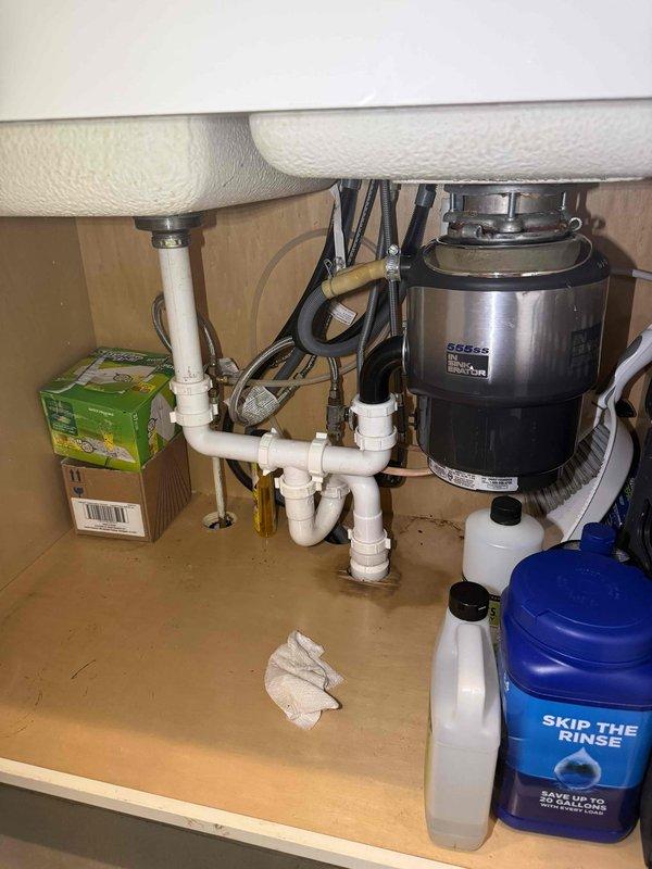 Cleared multiple clogs in bathroom fixtures including toilet and sink that had previously backed up into tub. Performed camera inspection of kitchen drain revealing significant buildup and confirmed presence of outdated S-trap configuration requiring replacement. Garbage disposal (InSinkErator 1/2 HP) appears properly installed but connected to problematic drain system.
