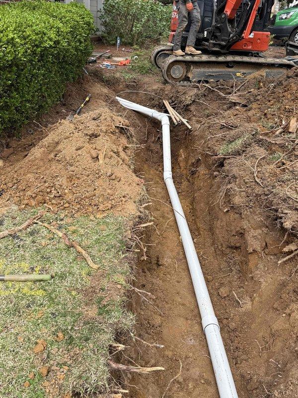 Completed sewer line repair involving excavation of damaged pipe section in residential front yard area. Utilized mini excavator to dig trench and install new white PVC sewer pipe, backfilled excavation site, and restored work area upon completion of underground utility repair.