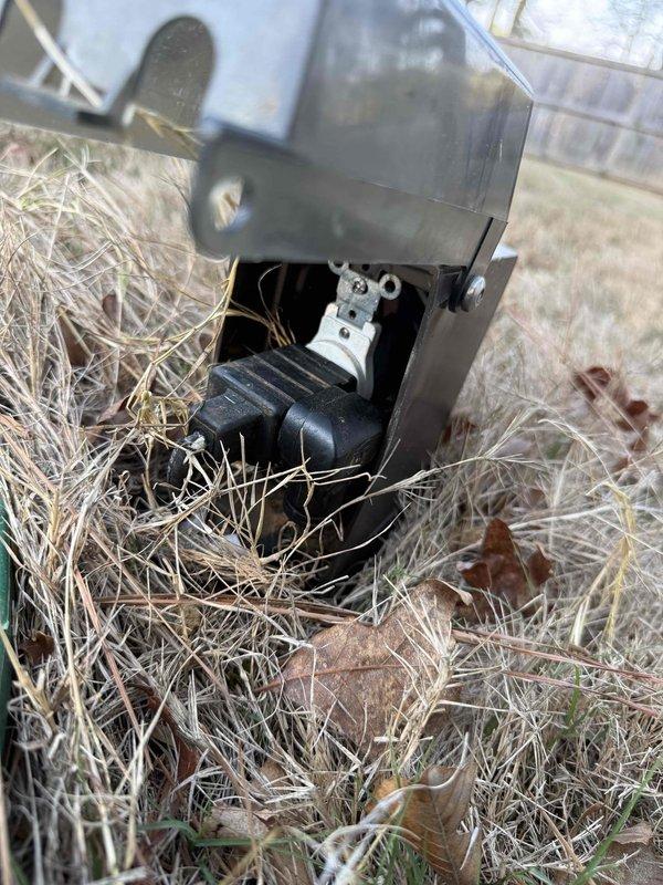 Responded to service call for sewage ejector pump reported as not operating normally. Upon inspection, accessed outdoor electrical enclosure housing pump control components. Evaluated electrical connections, capacitor, and control wiring within the weathered exterior disconnect box. Documented equipment condition and configuration for service records.