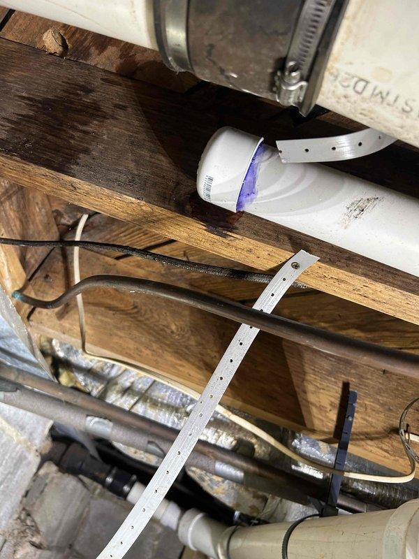 Completed bathroom drain repipe installation in crawl space and attic areas. Removed existing deteriorated drain lines and installed new white PVC drainage system with proper venting throughout the affected zones. Routed multiple drain lines through wooden framing members, securing pipes according to code requirements with appropriate hangers and supports. Installed various fittings including elbows, tees, and connectors to create functional drainage network. Applied primer and solvent cement to all PVC connections to ensure watertight, permanent joints. Coordinated pipe runs with existing structural elements including floor joists, studs, and foundation walls. Added black foam insulation to designated pipe sections for condensation control and noise reduction. Verified proper slope on all horizontal drain runs to ensure adequate drainage flow. System tested and confirmed operational with no leaks detected at any connection points.