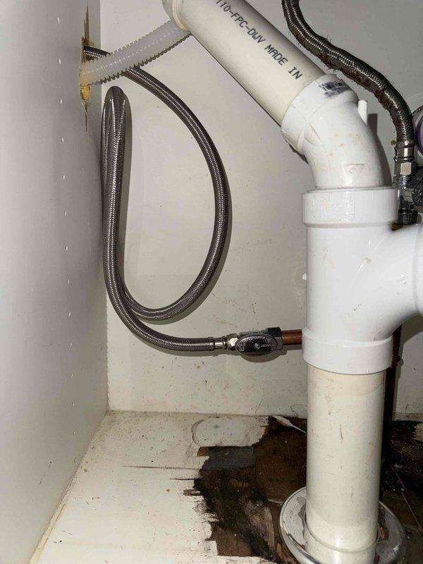 Completed dishwasher installation including water supply and drain line connections. Installed braided stainless steel supply line and connected PVC drainage system with proper trap configuration. Addressed pre-existing water damage and staining at cabinet base area during installation process.