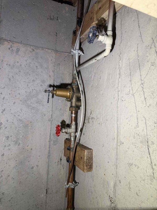 Responded to customer report of leaking pipe in basement plumbing system. Located leak at copper pipe connection near pressure reducing valve assembly mounted on exposed framing. Inspected valve body, pipe joints, and surrounding connections for source of water intrusion. Documented existing plumbing configuration and condition of copper piping showing age-related patina and oxidation for service records.