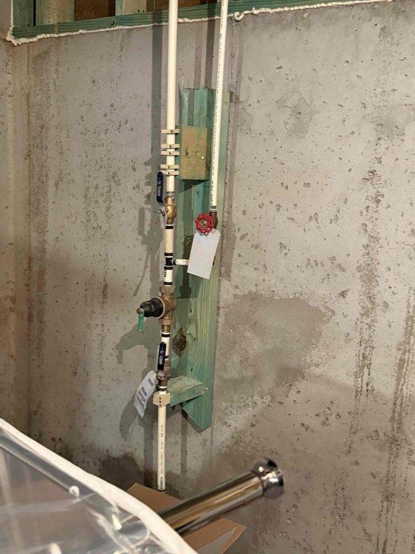 Responded to customer inquiry regarding shower cartridge replacement. Upon arrival, conducted thorough assessment of the plumbing system to locate and evaluate the shower valve assembly. Photographically documented existing plumbing infrastructure, including water pressure gauge reading and main water supply configuration mounted on basement utility wall. Inspected vertical PVC supply lines, shut-off valves, brass fittings, and connection points to determine system compatibility and identify the specific cartridge type required for replacement. Assessed water pressure levels and verified proper operation of isolation valves necessary for safe cartridge removal and installation.