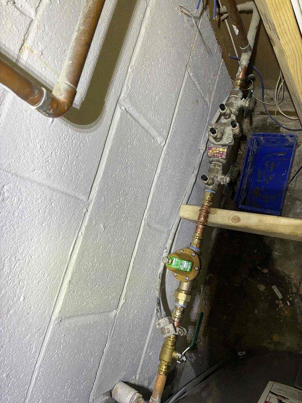 Successfully installed new pressure reducing valve (PRV) and thermal expansion tank as per approved quote specifications. Visual inspection confirmed proper installation of components on the copper pipe system, ensuring compliance with plumbing codes and optimal water pressure regulation.