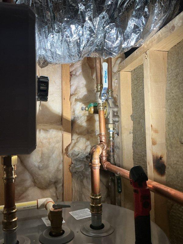 Completed tankless water heater upgrade installation, replacing existing conventional water heating system. Installed new wall-mounted tankless unit with proper venting, gas connections, and integrated plumbing network including PEX supply lines, copper piping, shut-off valves with isolation capability, and pressure relief components. All connections secured to structural framing per code requirements, system tested and verified operational.