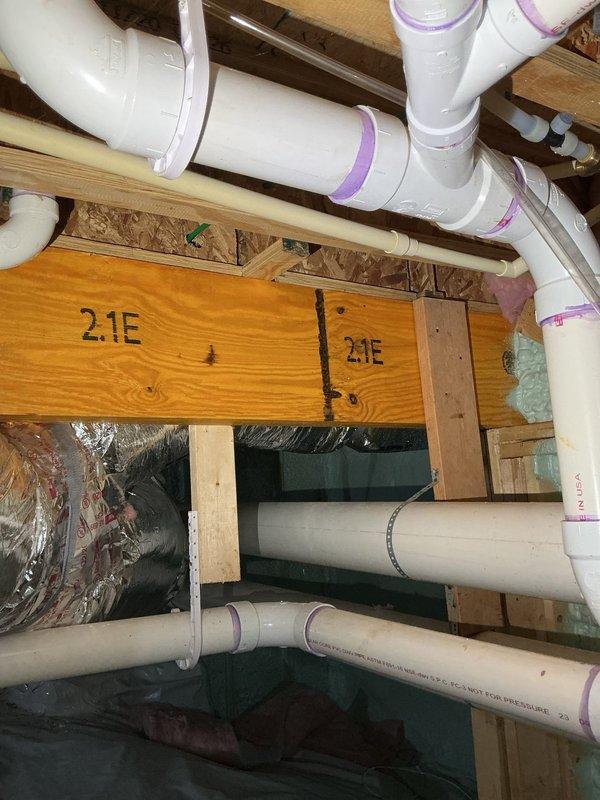 Completed bathroom drain repipe installation in crawl space and attic areas. Removed existing deteriorated drain lines and installed new white PVC drainage system with proper venting throughout the affected zones. Routed multiple drain lines through wooden framing members, securing pipes according to code requirements with appropriate hangers and supports. Installed various fittings including elbows, tees, and connectors to create functional drainage network. Applied primer and solvent cement to all PVC connections to ensure watertight, permanent joints. Coordinated pipe runs with existing structural elements including floor joists, studs, and foundation walls. Added black foam insulation to designated pipe sections for condensation control and noise reduction. Verified proper slope on all horizontal drain runs to ensure adequate drainage flow. System tested and confirmed operational with no leaks detected at any connection points.