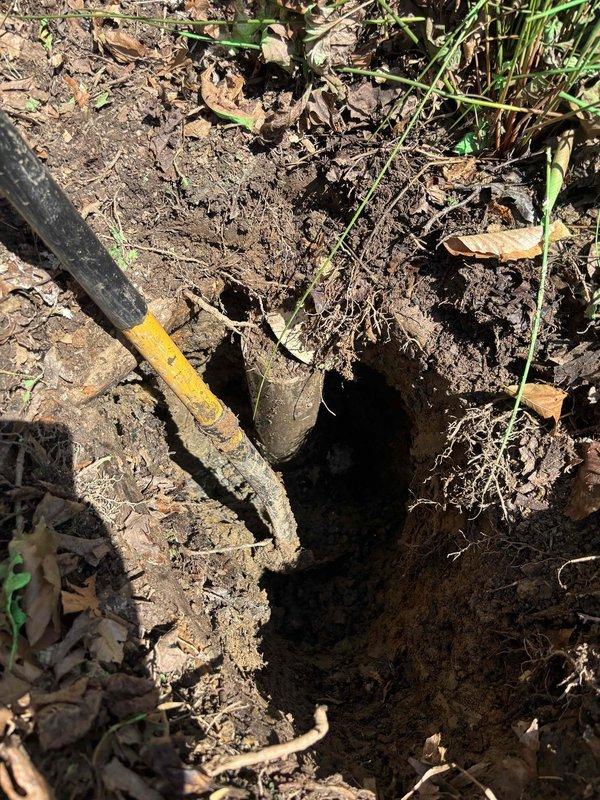 Completed sewer line repair involving excavation and replacement of deteriorated underground piping. Excavated access hole to expose failed sewer pipes showing severe corrosion, rust damage, and mineral buildup at connection points. Removed compromised metal pipes that exhibited extensive surface deterioration, oxidation, and structural failure. Replaced damaged sections with new piping to restore proper sewer function and prevent future leaks or blockages. Backfilled excavation and restored ground surface upon completion of repairs.