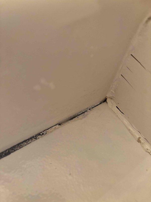 Responded to report of water intrusion in wall assembly. Upon inspection, identified significant separation at wall-to-ceiling joint with evidence of moisture penetration and debris accumulation in gap. Documented existing conditions with photographic evidence showing compromised joint integrity and surface markings requiring further assessment for proper remediation and sealing.