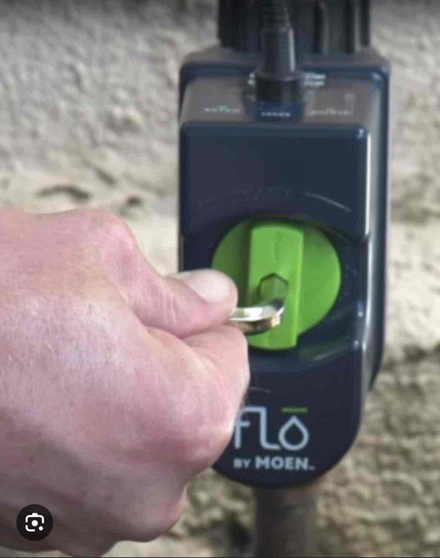 Responded to service call for inoperative Moen Flo water monitoring device that had shut off water supply to residence. Manually reset the device using the manufacturer's reset key and restored water service. Verified normal system operation through both physical inspection and confirmation via the Moen app interface.