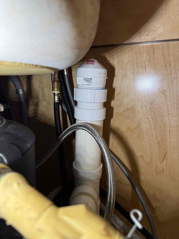 Responded to complaint of garbage disposal odor and bubbling in island sink. Upon inspection, identified improper drain venting causing air lock and sewage gas backup. Installed air admittance valve on disposal drain line to resolve negative pressure issues and eliminate odors. Tested system to confirm proper drainage and venting function.