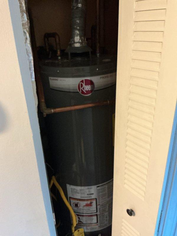 Performed inspection of 12-year-old 40-gallon Rheem gas water heater showing signs of corrosion. Unit is properly installed in utility closet with intact copper supply lines and no visible leaks. Recommended replacement due to age and visible corrosion to prevent potential failure.